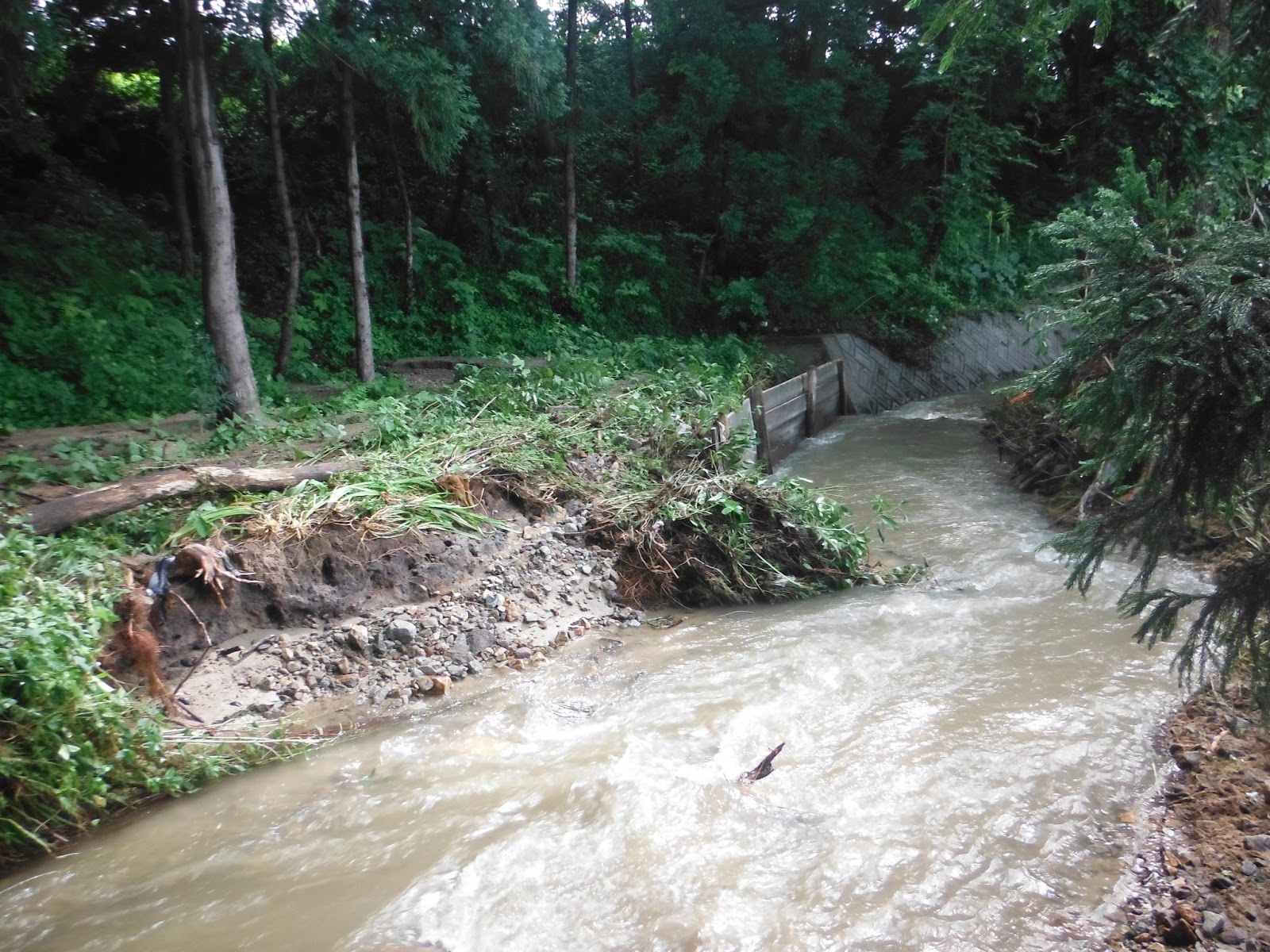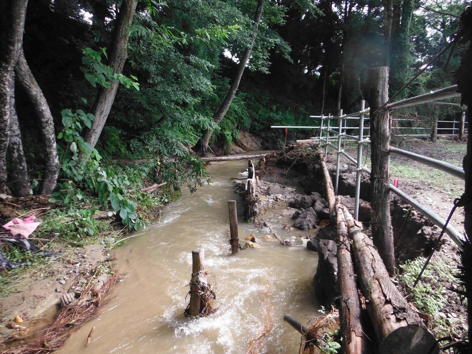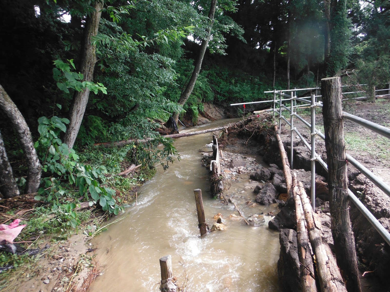 大雨による増水で 町の管理の本田沢川が 増水して 土手が