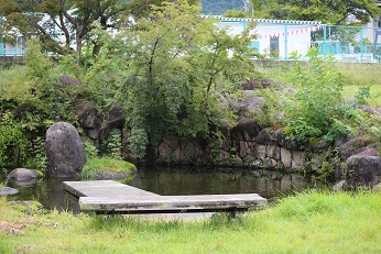 小学校の校庭と 境目のない(跨げる位の 小さな小川で