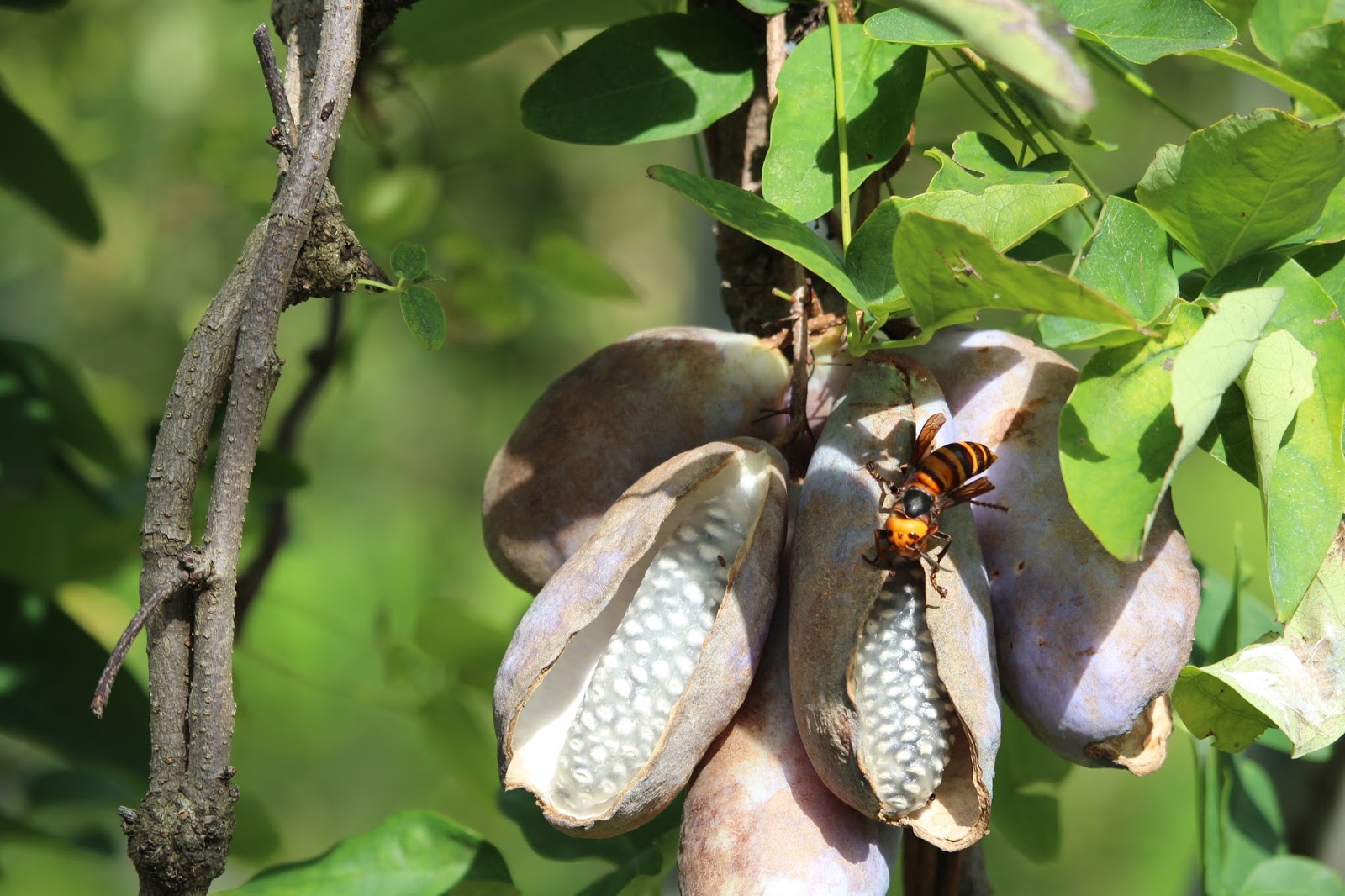 蜜を 集めていますが 割れた アケビの中に 大きな